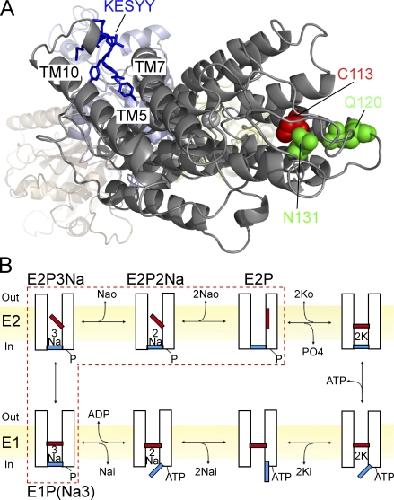 Figure 1. Structure of the Na/K pump α subunit and representation of its transport cycle. (A) Angled extracellular view of Na,K-ATPase α-subunit structure (Morth et al., 2007) indicating locations (Xenopus numbering) of mutations introduced here in Xenopus Na,K-ATPase α1 subunits to confer ouabain resistance, C113Y (red) or Q120R/N131D (green), and C-terminal truncation, ΔYY or ΔKESYY (blue). (B) Cartoon of an alternating-gate representation (Artigas and Gadsby, 2003) of the Post-Albers transport cycle of the Na/K pump, indicating E1 states with the extracellular-side gate (red) closed and cytoplasmic access to ion-binding sites and E2 states with the cytoplasmic-side gate (blue) closed and extracellular access to ion-binding sites. The dashed box encloses the phosphorylated pump conformations linked in a voltage-dependent equilibrium in the presence of saturating Nai and ATP and of Nao but in the absence of Ko.