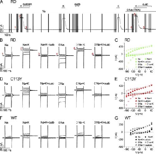 Figure 2. Determination of steady-state Na/K pump current of WT and ouabain-resistant RD and C113Y mutant pumps in the presence and absence of external Na (replaced by TMA). (A) Representative record of current changes at the −50-mV holding potential in a Na-loaded oocyte expressing RD Na/K pumps caused by addition of 15 mM Ko and/or 10 mM ouabain in the presence and then in the absence of Nao as indicated; the vertical lines mark application of 100-ms voltage steps to −180 to 60 mV in 20-mV increments. (B) Selected superimposed current traces from the experiment in A obtained at the times identified on the recording by the red numbers. Analogous traces are superimposed for C113Y (D) and WT (F) pumps. The corresponding steady-state (mean of last 10 ms of each step) current–voltage (I-V) relationships for each Na/K pump type, obtained from the records in B, D, and F, are shown in C, E, and G.