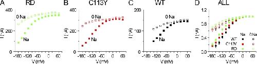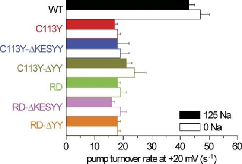 Figure 4. Comparison of the magnitude of ouabain-sensitive inward current in each pump type at −180 mV (−160 mV for WT) in the absence or presence of 125 mM Nao after normalization by the ouabain-sensitive pump current activated by 15 mM [Ko] at the −50-mV holding potential in the same oocyte and [Nao] to allow for differences in expression. Open bars, absence of 125 mM Nao; closed bars, presence of 125 mM Nao. Mean values are −0.04 ± 0.02, n = 4, in 125 mM Nao and −0.17 ± 0.05, n = 4, in 0 mM Nao for WT Na/K pumps (black); −0.20 ± 0.03, n = 8, in 125 mM Nao and −2.0 ± 0.1, n = 8, in 0 mM Nao for C113Y (red); −2.6 ± 0.4, n = 5, in 125 mM Nao and −2.8 ± 0.4, n = 5, in 0 mM Nao for C113Y-ΔKESYY (blue); −1.8 ± 0.2, n = 6, in 125 mM Nao and −3.2 ± 0.6, n = 6, in 0 mM Nao for C113Y-ΔYY (olive); −0.10 ± 0.02, n = 7, in 125 mM Nao and −1.9 ± 0.1, n = 7, in 0 mM Nao for RD (green); −1.6 ± 0.1, n = 8, in 125 mM Nao and −0.43 ± 0.03, n = 8, in 0 mM Nao for RD-ΔKESYY (magenta); and −1.9 ± 0.1, n = 7, in 125 mM Nao and −0.60 ± 0.08, n = 7, in 0 mM Nao for RD-ΔYY (orange). Error bars represent SEM.