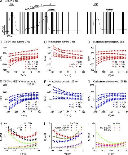 Figure 5. Ko sensitivity of Na/K pump–mediated currents in Nai-loaded oocytes expressing WT or mutant Na/K pumps. (A) Changes in holding current at −50 mV in response to stepwise increments of [Ko] in C113Y Na/K pumps in 0 mM Nao; the vertical lines mark application of 100-ms voltage steps to −140 to 40 mV in 10-mV increments. (B) Steady-state I-V plots at the indicated [Ko] from A. (C and D) Corresponding Ko-modulated I-V plots (C) and ouabain-sensitive I-V plots (D) from data in A and B obtained by appropriate subtraction. (E–G) Analogous I-V plots to those in B–D, but for C113Y-ΔKESYY Na/K pumps in 125 mM Nao. (H–J) Hill fits to the Ko-modulated steady currents at the various [Ko] at each voltage yielded the mean K0.5(Ko) values for each pump type in the absence (open circles) or presence (closed circles) of Nao (WT, black; C113Y, red; RD, green; C113Y-ΔKESYY, blue; C113Y-ΔYY, olive; RD-ΔKESYY, magenta; RD-ΔYY, orange). Error bars represent SEM.