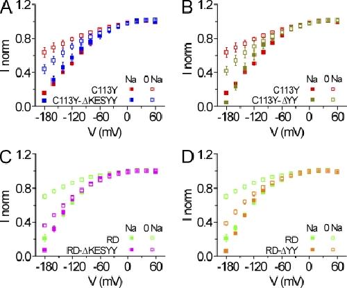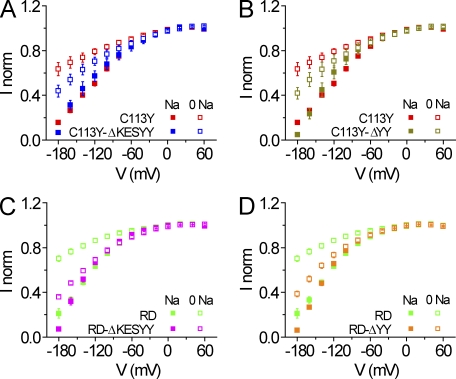 Figure 6. Diminished difference between 125 mM and 0 mM Nao at large negative potentials in ΔYY and ΔKESYY truncated Na/K pumps. (A–D) Mean ouabain-sensitive outward Na/K pump currents (normalized as in Fig. 3 D; mean ± SEM of 6–12 oocytes from at least two frogs) at 15 mM [Ko] and 0 mM Nao (open squares) or 125 mM Nao (closed squares) for ΔKESYY (A and C) and ΔYY (B and D) truncated pumps are shown superimposed on the corresponding I-V plots for the parent C113Y (A and B) and RD (C and D) pumps: (A) C113Y (red) and C113Y-ΔKESYY (blue); (B) C113Y (red) and C113Y-ΔYY (olive); (C) RD (green) and RD-ΔKESYY (magenta); (D) RD (green) and RD-ΔYY (orange). Error bars represent SEM.