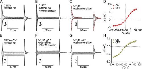 Figure 8. Representative ouabain-sensitive pre–steady-state currents under Na/Na exchange conditions for C113Y and C113Y-ΔYY pumps. (A–D) C113Y pumps; (E–H) C113Y-ΔYY pumps. Superimposed current records obtained in 125 mM Nao before (A, C113Y; E, C113Y-ΔYY) and after (B, C113Y; F, C113Y-ΔYY) adding 10 mM ouabain. Ouabain-sensitive transient currents determined by direct subtraction of the records in A and B and in E and F, respectively, are shown in C for C113Y and in G for C113Y-ΔYY Na/K pumps (red lines in C show single exponential fits to ON and OFF transient currents elicited by steps to 60 mV and −180 mV for relaxation rate estimates of Fig. 9 [C and D]). Pre–steady-state charge was obtained directly as the time integral of the transient currents (C and G) at the ON and OFF voltage steps after baseline subtraction of any steady current. (D and H) The charge–voltage distributions were fit with the Boltzmann relationQ(V)=Qmax+(Qmin−Qmax)1+e[zqF(V−V0.5)/RT],where V is the test voltage, Qmin and Qmax are the charge moved for extreme negative and positive voltage steps, zq is the effective charge, V0.5 is the midpoint voltage, and F, R, and T have their usual meaning. ON and OFF values are, respectively, for D as follows: Qmin, −4.0 nC and −3.9 nC; Qmax, 7.5 nC and 8.2 nC; zq, 0.74 and 0.71; V0.5, −29 mV and −25 mV. ON and OFF values are, respectively, for H as follows: Qmin, −3.8 nC and −3.7 nC; Qmax, 1.9 nC and 1.7 nC; zq, 0.66 and 0.69; V0.5, −74 mV and −77 mV.