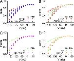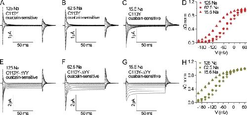 Figure 10. Similar Nao dependence and voltage dependence of transient charge movements in parent C113Y pumps and in C113Y pumps with C-terminal truncations. (A–C) Superimposed ouabain-sensitive current records (obtained by subtraction as in Fig. 8 [C and G]) determined in the same oocyte for C113Y pumps exposed to 125 mM (A), 62.5 mM (B), and 15.6 mM (C) [Nao]; Na was replaced by equimolar TMA. (E–G) Similar ouabain-sensitive transient currents in an oocyte expressing C113Y-ΔYY pumps exposed to 125 mM (E), 62.5 mM (F), and 15.6 mM (G) [Nao]; note that the steady inward currents at negative test voltages became larger as [Nao] was lowered (E–G). (D and H) Pre–steady-state charge determined as integrals of OFF transients was plotted against test voltage and fitted with Boltzmann relations and then normalized and averaged for four C113Y oocytes (D) and three C113Y-ΔYY oocytes (H). ΔV0.5 for the twofold and eightfold reductions of [Nao], respectively, averaged as follows: C113Y (red), −22 ± 1 mV and −80 ± 3 mV, n = 4; C113Y-ΔYY (olive), −25 ± 2 mV and −90 ± 10 mV, n = 3; C113Y-ΔKESYY, −33 mV and −102 mV, n = 1. Fractional electrical distance, λ, estimated from these data via ΔV0.5 = (RT/λF)ln([Nao]1/[Nao]2) is ∼0.7 (0.73 for C113Y and 0.65 for C113Y-ΔKESYY), as for WT.