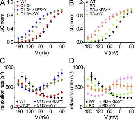 Figure 9. ΔYY and ΔKESYY truncations shift ouabain-sensitive transient charge movements to more negative potentials and accelerate charge relaxation at positive potentials. (A and B) Charge–voltage distributions determined from OFF voltage steps (as for closed symbols in Fig. 8 [D and H]) were normalized by their estimated amplitude from fits (Qmax–Qmin, 12.1 nC and 5.4 nC, respectively, for Fig. 8 [D and H]) and were averaged. V0.5 and zq values for each pump type averaged as follows: WT (black), −16 ± 1 mV and 0.93 ± 0.03, n = 3; C113Y (red), −26 ± 1 mV and 0.70 ± 0.01, n = 13; RD (green), −44 ± 1 mV and 0.74 ± 0.02, n = 12; C113Y-ΔKESYY (blue), −96 ± 2 mV and 0.62 ± 0.05, n = 7; C113Y-ΔYY (olive), −75 ± 1 mV and 0.67 ± 0.01, n = 5; RD-ΔKESYY (magenta), −114 ± 2 mV and 0.59 ± 0.02, n = 11; RD-ΔYY (orange), −95 ± 2 mV and 0.60 ± 0.02, n = 5. (C and D) Single exponential fits to the decay time courses of the transient current elicited by the ON voltage steps (e.g., Fig. 8 C, red lines) gave relaxation rates of the slow components of charge movement; their mean values are plotted against voltage in C and D. Error bars represent SEM.