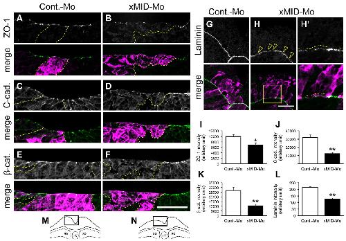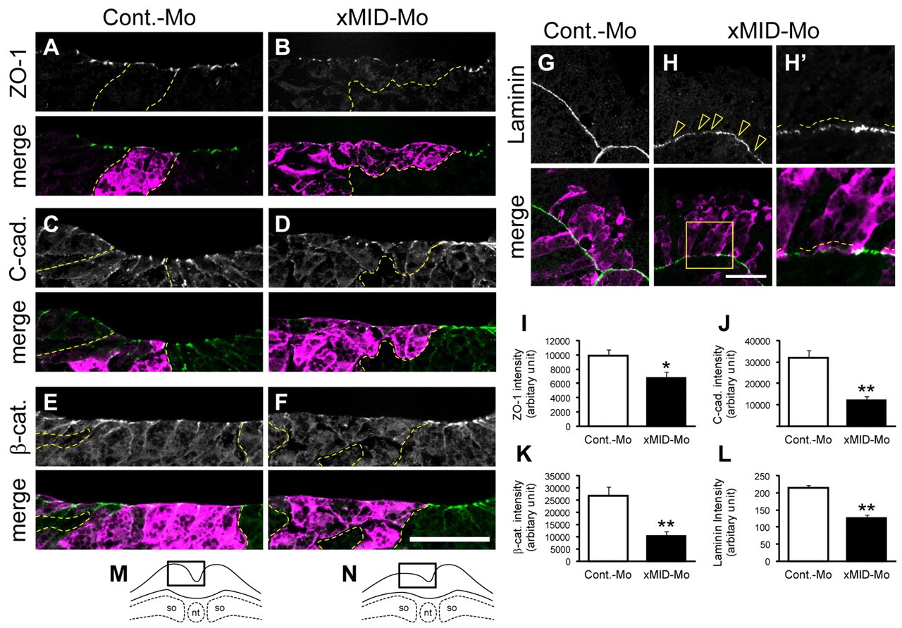 Fig. 4. xMIDs regulate the localization of adhesive molecules. (A-Hâ²) Transverse sections through the neural plate of unilaterally control-Mo-injected (Cont.-Mo) (A,C,E,G) and xMID-Mo-injected (B,D,F,H) Xenopus embryos at stage 15.5, stained with antibodies against ZO-1 (A,B), C-cadherin (C-cad.) (C,D), β-catenin (β-cat.) (E,F), or laminin (G,H). Flag-β-globin mRNA (250 pg) was co-injected as a tracer, and stained with an anti-Flag antibody (magenta). (A-F) Dashed lines indicate Flag-positive Mo-injected cells. (H) Arrowheads indicate the attenuation of laminin accumulation basal to the xMID-Mo-injected cells. (Hâ²) Higher-magnification view of the boxed area in H. Scale bars: 50 μm. (I-L) Quantification of marker intensities in the morphants at stage 15.5. For ZO-1 intensity: control-Mo, n=27 sites (3 embryos); xMID-Mo, n=44 sites (6 embryos). For C-cadherin: control-Mo, n=16 sites (4 embryos); xMID-Mo, n=20 sites (5 embryos). For β-catenin: control-Mo, n=7 sites (3 embryos); xMID-Mo, n=15 sites (4 embryos). For laminin: control-Mo, n=19 sites (4 embryos); xMID-Mo, n=19 sites (3 embryos). *P<0.05, **P<0.001. (M,N) Schematic illustrations showing the control (M) and xMID (N) morphants. Rectangles indicate the regions analyzed in this study. so, somite; nt, notochord.