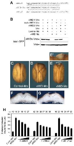 Fig. 2. Depletion of xMIDs causes neural tube defects. (A) The complementary sequence of the xMID-Mo compared with xMID1 and xMID2. The ATG codons for the first methionine are underlined. (B) Western blot analysis of the N-terminal domain of the xMID proteins, tagged with Venus at the C-terminus (xMID1-Vns, xMID2-Vns, 250 pg), probed with an anti-GFP antibody. The xMID-Mo (17 ng) did not block translation of the mRNA for Venus (Vns, 100 pg) or the mRNA for xMID1-Venus with six silent mutations in the Mo recognition site (mut-xMID1-Vns, 250 pg). (C,D) Dorsal views of the unilaterally injected morphants; anterior is to the top. Control-Mo (C) or xMID-Mo (D) was injected into the right dorsal blastomere at the four-cell stage. Dashed lines indicate the boundaries between the neural and non-neural ectoderm. The black bracket marked by an asterisk indicates the distance between the neural folds in a rescue experiment. (E) Dorsal view of bilaterally injected xMID morphants at stage 20; anterior is to the top. (Eâ²) Higher magnification view of the area marked by the bracket in E. (F,G) Transverse sections through the neural plate of Xenopus embryos with unilateral injection of control-Mo (F) or xMID-Mo (G). Dashed lines indicate the outlines of neural tissues, and brackets show the distance between the neural folds in a rescue experiment. (H) Average distance between the neural folds of unilaterally injected xMID morphants were dose-dependently reduced by the Mo-insensitive xMID1 (50, 100, 200, 500 pg), xMID2 (50, 100, 200, 500 pg), or xMID1+2 (25, 50, 100, 250 pg each) mRNAs. The number of embryos examined is indicated above each bar.