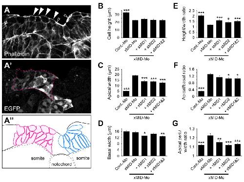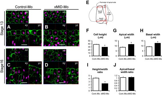 Fig. S4. Cell morphology is affected in xMID morphants. (A-D) Three-dimensional analysis of neuroepithelial cells. Transverse sections through the neural plate of embryos at stages 13 (A,B) and 16 (C,D) that had been given unilateral injections of control-Mo (A,C) or xMID-Mo (B,D), and stained with TO-PRO-3 (magenta). mRNA (50 pg) encoding membrane-bound EGFP was co-injected as a tracer (green). Scale bars: 20 . (E) Definition of the quantified morphological features. Cell height, apical width, basal width, and the perimeter of the apical side are defined as indicated by red lines. See Materials and methods for details. (F-J) Quantitative data for the morphological features in the deep layer of unilaterally injected xMID morphants. Control-Mo (Cont.-Mo), n=36 cells, 4 embryos; xMID-Mo, n=59 cells, 6 embryos. *P<0.001.