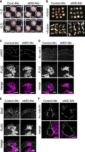 Fig. S2. Knockdown of xMID has few specific effects. (A) Vegetal views of control-Mo-injected (Cont.-Mo, left) and xMID-Mo-injected (right) embryos at stage 11.5 (top) and 12.5 (bottom). Injection of xMID-Mo into the dorsal marginal zone of the four-cell embryo did not inhibit blastopore closure. (B) Animal cap elongation assay of control-Mo-injected (left) and xMID-Mo-injected (right) embryos. Injection of xMID-Mo did not inhibit animal cap elongation induced by activin mRNA. (C-E) Transverse sections through the neural plate of control-Mo-injected (left) and xMID-Mo-injected (right) embryos at stage 15.5, stained with antibodies against phospho-histone H3 (C, top), active caspase 3 (D, top) and Sox2 (E, top). Flag-β-globin mRNA (250 pg) was injected as a tracer, and stained with an anti-Flag antibody (middle). Knockdown of xMIDs did not have any obvious effects on mitosis, apoptosis or neural specification. (F) Transverse sections through the trunk ventral neural tube of control-Mo-injected (left) and xMID-Mo-injected (right) embryos at stage 27, stained with anti-acetylated tubulin antibody (Ac.-tubulin). mRNA encoding membrane-bound mRFP (125 pg) was injected as a tracer (magenta). Knockdown of xMIDs did not have any obvious effect on primary ciliogenesis in the neural tube. Dashed lines in C-F indicate the outlines of neural tissues. Scale bars: 50 in C-E; 10 in F.