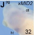 mid2 (midline 2) gene expression in Xenopus laevis embryo, via in situ hybridization, NF stage 32, lateral view, dorsal up, anterior left.