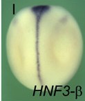 foxA2 (forkhead box A2) gene expression in Xenopus laevis embryo, via in situ hybridization, NF stage 17, dorsal view, anterior up.