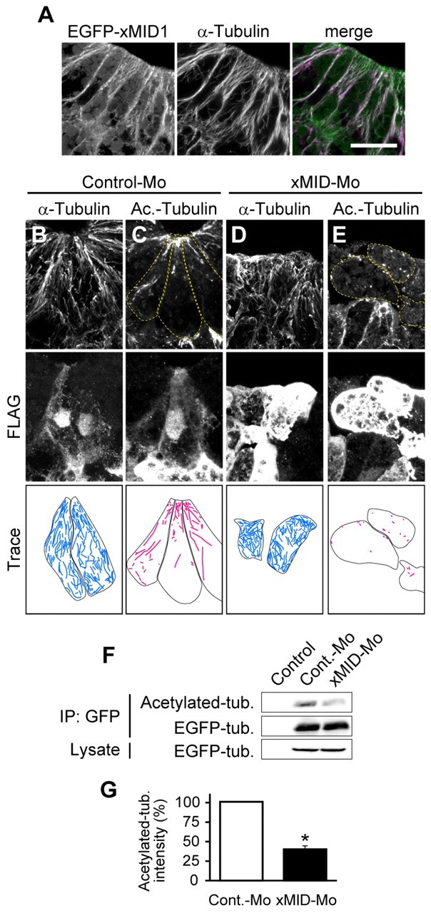 Fig. 5. xMIDs associate with and regulate microtubules. (A) Transverse section through the neural plate of a Xenopus embryo injected with EGFP-xMID1 mRNA (50 pg) at stage 15.5, and stained with anti-GFP and anti-α-tubulin antibodies. Scale bar: 20 μm. (B-E) Transverse sections through the neural plate of embryos unilaterally injected with control-Mo (B,C) or xMID-Mo (D,E), and stained for α-tubulin (B,D) or acetylated tubulin (Ac.-Tubulin) (C,E) antibodies. Flag-β-globin mRNA (250 pg) was co-injected as a tracer, and stained with an anti-Flag antibody (middle panels). Bottom panels show traced drawings of cells stained by α-tubulin and anti-acetylated tubulin antibodies. (F) Western blots of immunoprecipitates (IP) or lysates from embryos expressing EGFP-tubulin (EGFP-tub.) mRNA (1 ng), detected with anti-GFP and anti-acetylated tubulin (Acetylated-tub.) antibodies. Immunoprecipitation was performed using the anti-GFP antibody. (G) Quantification of immunoprecipitation assay, showing the signal intensities of acetylated tubulin from three independent experiments, normalized to those of EGFP-tubulin. Error bars indicate s.e.m. *P<0.01.