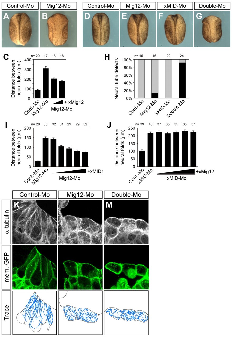 Fig. 6. Mig12 functions with xMIDs in neural tube closure. (A,B) Dorsal views of Xenopus embryos given bilateral injections of control-Mo (A) or Mig12-Mo (B); anterior is to the top. (C) Average distance between the neural folds of unilaterally injected Mig12 morphants was reduced by the Mo-insensitive Mig12 mRNA (25, 50 pg). (D-H) Synergistic effects of Mig12-Mo and xMID-Mo on neural tube closure. Dorsal views, anterior to the top. Injection of low doses (8.4 ng) of Mig12-Mo (E) or xMID-Mo (F) caused slight delays in neural tube closure. Co-injection of Mig12-Mo and xMID-Mo (8.4 ng each) induced severe NTDs (G,H). (I) Average distance between the neural folds of unilaterally injected Mig-12 morphants was reduced dose-dependently by xMID1 mRNA (50, 100, 250, 500, 1000 pg). (J) Average distance between the neural folds of unilaterally injected xMID morphants was not reduced by Mig12 mRNA (25, 50, 100, 250, 500 pg). The number of embryos examined in C,H,I,J is indicated above each bar. (K-M) Transverse sections through the neural plate of embryos given unilateral injections of control-Mo (K, 8.4 ng), Mig12-Mo (L, 17 ng), or Mig12-Mo and xMID-Mo (M, 8.4 ng each), stained with α-tubulin (top) and anti-GFP (middle) antibodies. mRNA (125 pg) encoding membrane-bound EGFP was co-injected as a tracer. Bottom panels show traced drawings of cells stained by anti-α-tubulin.