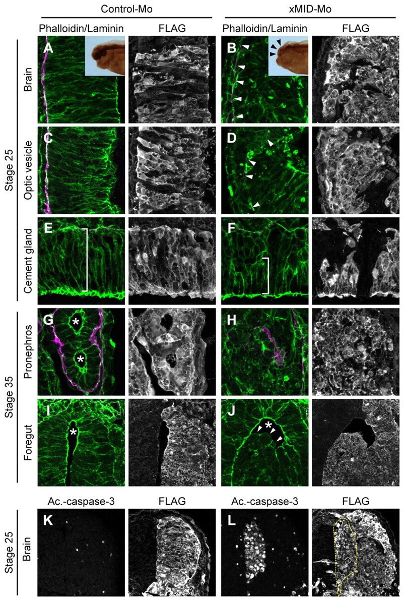 Fig. 7. xMIDs function in the developing brain and other epithelial organogeneses. (A-J) Transverse sections through the brain (A,B), optic vesicle (C,D), cement gland (E,F), pronephros (G,H) and foregut (I,J) of Xenopus embryos injected with control-Mo (A,C,E,G,I) or xMID-Mo (B,D,F,H,J), and stained with phalloidin (green), anti-laminin antibody (magenta), or anti-Flag antibody (gray). (A,B) Insets show stage 40 embryos stained for the pan-neural marker Xen1. Lateral views: anterior to the left, dorsal to the top. Arrowheads indicate head defects in the xMID morphant. (B,D) Arrowheads indicate non-continuous and attenuated laminin staining in the basal lamina. (E,F) Brackets indicate the lengths of Flag-positive cells. (G) Asterisks indicate tubular structures of the pronephros. (I,J) Asterisks indicate luminal structures of the foregut. Arrowheads indicate the lack of apical actin assembly in the xMID morphant cells. (K,L) Transverse sections through the brain of control-Mo-injected (K) and xMID-Mo-injected (L) embryos, stained with anti-active caspase 3 (left) and anti-Flag (right) antibodies. Dashed line delimits the ventricle.