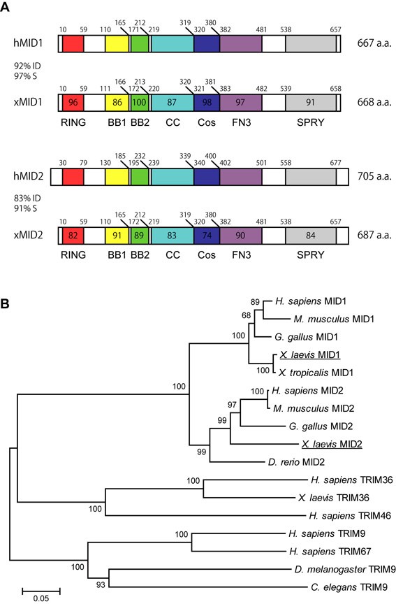 Fig. S1. Identification of Xenopus homologs of MID1 and MID2. (A) Structural characterizations of xMID1 and xMID2. Schematic depiction of the structures of human MIDs and their Xenopus homologs. The overall percentages of identical (ID) and similar (S) amino acids are given on the left. Numbers in the boxes denote the percentage amino acid identity between known functional domains. RING, RING-finger; BB, B-box; CC, coiled coil; Cos, Cos box; FN3, Fibronectin type 3; SPRY, SPla/RYanodine receptor. (B) Phylogenetic tree of the C-I subfamily members in the RBCC/TRIM superfamily, inferred using the neighbor-joining method. Bootstrap consensus figures from 500 replicates are shown next to the branches.