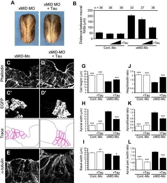 Fig. S5. Tau partially rescues the neural tube defects in xMID morphants. (A) Dorsal views of the unilaterally injected xMID morphants, anterior to the top. Co-injection of tau mRNA (12.5 pg) reduced the distance between the neural folds. Dashed lines indicate the boundaries between neural and non-neural ectoderm. (B) The average distance between the neural folds of unilaterally injected xMID morphants was reduced by tau mRNA (6.25, 12.5 pg). The number of embryos examined is indicated above each bar. (C-F) Transverse sections through the neural plate of unilaterally injected xMID morphants with (D,F) or without (C,E) tau (12.5 pg), stained with phalloidin (C,D) or anti-α-tubulin antibody (E,F). EGFP mRNA (50 pg) was co-injected as a tracer (Câ²,Dâ²). Schematic illustrations of morphant cells (outlined in pink) in C,D are shown. (G-L) Quantification of cell morphological features in the superficial layer. Control-Mo (Cont.-Mo), n=41 cells, 7 embryos; Control-Mo + tau, n=43 cells, 9 embryos; xMID-Mo, n=86 cells, 13 embryos; xMID-Mo + tau, n=65 cells, 9 embryos. *P<0.01, **P<0.005, ***P<0.001, compared with xMID-Mo.