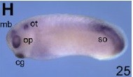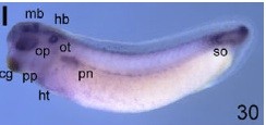 mid1 (midline 1 ) gene expression in Xenopus laevis embryo, via in situ hybridization, NF stage 30, lateral view, dorsal up, anterior left.