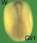 gli1(GLI family zinc finger 1) gene expression in Xenopus laevis embryo, via in situ hybridization, NF stage 17, dorsal view, anterior up.