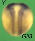 gli3 (GLI family zinc finger 3) gene expression in Xenopus laevis embryo, via in situ hybridization, NF stage 15/16, dorsal view, anterior up