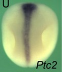 ptch2 (patched 2)gene expression in Xenopus laevis embryos, NF stage 15, as assayed by in situ hybridization, dorsal view, anterior up.