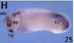 mid1 (midline 1 (Opitz/BBB syndrome)) gene expression in Xenopus laevis embryo, via in situ hybridization, NF stage 25, lateral view, dorsal up, anterior left.