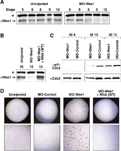 Fig. 1. Wee1-depletion using antisense morpholino oligonucleotides (MO). (A) MO-Wee1 was injected into both cells of a two-cell embryo. Uninjected and MO-Wee1-injected embryos were collected at various stages and lysates examined by immunoblot analysis using anti-Wee1 antibodies (* indicates a nonspecific band). (B) Two-cell embryos were injected with MO-Control, MO-Wee1 or co-injected with MO-Wee1 and WT Wee1 RNA (MO-Wee1+RNA). Embryos were collected at stage 10 and lysates examined as in A. (C) Embryos injected as in B were collected at stage 8, 10 or 12. Lysates were examined by immunoblot analysis using anti-phospho-Cdc2 or anti-Cdc2 antibodies. (D) The mitotic nuclei of injected stage 11 embryos were visualized by whole-mount immunostaining using phospho-histone H3 (αPH3). Mitotic index (n=10-12 embryos): MO-control, 8.9% (4739 nuclei); uninjected, 9.9% (1221 nuclei); MO-Wee1, 24.5% (4734 nuclei); MO-Wee1+RNA, 11.4% (2736 nuclei).