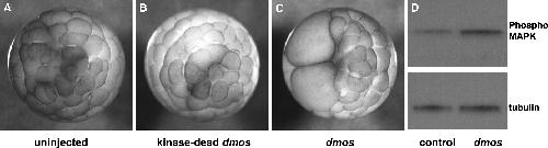 In metazoan oocytes, a metaphase arrest coordinates the completion of meiosis with fertilization. Vertebrate mos maintains the metaphase II arrest of mature oocytes and prevents DNA replication between the meiotic divisions. We identified a Drosophila homolog of mos and showed it to be the mos ortholog by two additional criteria. The dmos transcripts are present in Drosophila oocytes but not embryos, and injection of dmos into Xenopus embryos blocks mitosis and elevates active MAPK levels. In Drosophila, MAPK is activated in oocytes, consistent with a role in meiosis. We generated deletions of dmos and found that, as in vertebrates, dmos is responsible for the majority of MAPK activation. Unexpectedly, the oocytes that do mature complete meiosis normally and produce fertilized embryos that develop, although there is a reduction in female fertility and loss of some oocytes by apoptosis. Therefore, Drosophila contains a mos ortholog that activates a MAPK cascade during oogenesis and is nonessential for meiosis. This could be because there are redundant pathways regulating meiosis, because residual, low levels of active MAPK are sufficient, or because active MAPK is dispensable for meiosis in Drosophila. These results highlight the complexity of meiotic regulation that evolved to ensure accurate control over the reproductive process.