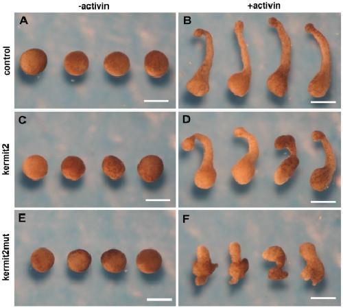 Figure 3. Animal cap assays (A, C, E) minus activin or (B, D, F) plus activin.(A, B) Control activin-treated animal caps extend. (C, D) Kermit2 has no effect on activin-treated animal cap extension. (E, F) Kermit2mut inhibits activin-treated animal cap elongation. Size marker â=â100 µM.