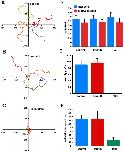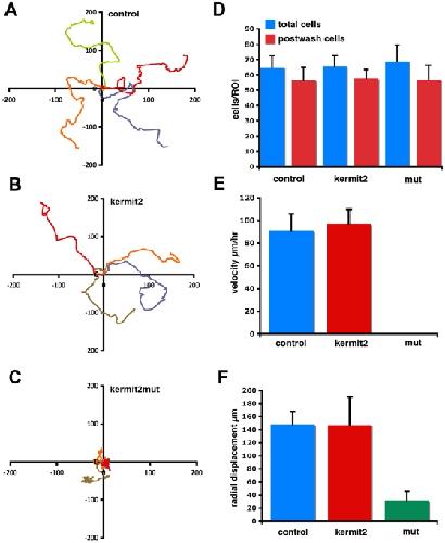 Figure 7. Cell adhesion assays.(AâC) Spider graphs representing migration tracks of individual cells plated on FN substrates. Each graph contains 4 representative tracks with the start point set to (0,0). Horizontal and vertical scale is in µM. (C) Kermit2mut expressing cells have reduced migration paths as compared to (A) control and (B) kermit2 expressing cells. (D) Quantification of activin-treated cell adhesion to FN substrates. Cells were plated on FN substrates and counted pre-wash (blue) and after washing to remove non-adherent cells (red). Control, kermit2, and kermit2mut expressing cells all show similar affinity for FN substrates. (E) Activin-treated cell migration rate mediated by kermit2. Average cell migration velocities were measured using the track cells function of Openlab. The value for each construct represents the average (±SD) of 45 cells from three spawnings. Cells expressing the kermit2mut construct (0.6 µM/hr) migrate significantly (P<0.005) slower than control (91 µM/hr) or kermit2 (97 µM/hr) expressing cells. (F) The radial displacement of activin-treated cells on FN substrates. Measurements are from the same cells as represented in (E). Kermit2mut expressing cells travel significantly (P<0.01) less distance (32 µM) than control (148 µM) or kermit2 expressing cells (147 µM).