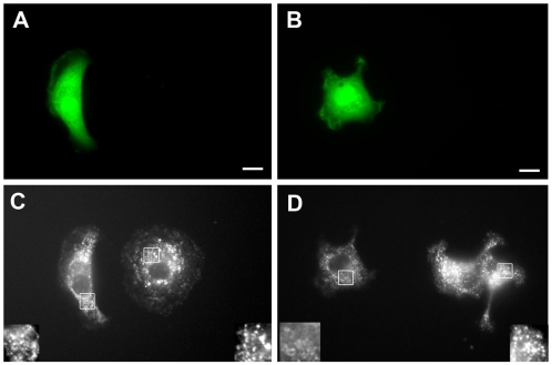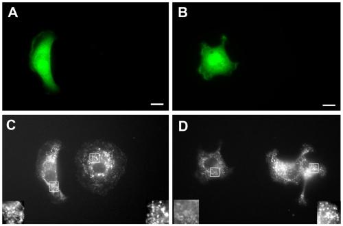 Figure 8. Kermit2 regulates internalization of antibody bound α5β1 integrin.Xenopus A6 cells were transfected with (A) GFP-tagged kermit2, or (B) GFP-tagged kermit2mut and the endocytosis of antibody labeled α5β1 was estimated from fluorescent intensity using the density slice function of Openlab. (C, D) Staining of internalized α5β1 with fluorescent anti-mouse antibody. Non-transfected cells in the same dish act as controls. Insets in C and D represent 25 µM2 ROI's used to estimate pixel densities. (A, C) Kermit2 transfected cells have 827.3±23.0 pixels/ROI as compared to control cell ROI pixel densities of 841.5±13.3 pixels/ROI. (B, D) In kermit2mut transfected cells the ROI pixel density is 530.8±51.2, while in non-transfected cells from the same dish have an average pixel density of 832.5±24.3 pixels/ROI. Pixel densities represent averages (±SD) from 10 individual cells from 4 separate transfections. Size marker â=â25 µM.