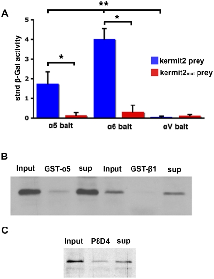 Figure 1. Kermit2 interacts with the cytoplasmic domain of the α5 and α6 integrin subunits.(A) Yeast two two-hybrid assays were conducted using α5, α6 and αV cytoplasmic domains as bait in combination with kermit2 or kermit2mut as prey. The data is presented as average normalized β-galactosidase activity (±SD). The interaction of kermit2 with α5 and α6 is abolished by the AEEL mutation in kermit2mut (* P<0.002). The αV subunit does not interact with kermit2 or kermit2mut (** indicates P<0.001 between α5 or α6 and αV bait constructs). (B) GST pulldowns. HA tagged Kermit2 is detected in lysates (lane 1 input), and is pulled down with a GST-α5 fusion construct (lane 2 GST-α5). Most of the kermit2 remains in the supernatant (lane 3 sup). A control GST-β1 construct (lane 5 GST-β1) does not pull Kermit2 from lysates (lane 4 input, lane 6 sup). (C) Coimmunoprecipitation of kermit2 with α5β1 integrin. HA tagged kermit2 is detected in lysates (lane 1 input). Kermit2 is found in association with immunoprecipitated α5β1 (lane 2 P8D4), while a significant portion of kermit2 remains in the supernatant (sup).