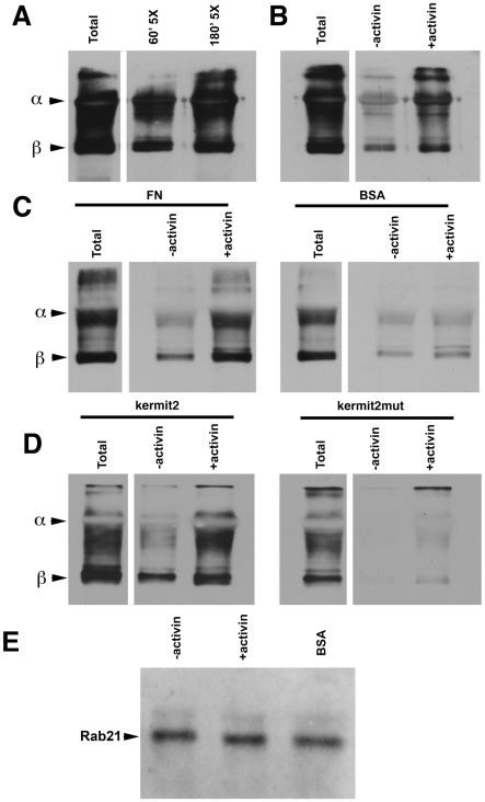 During Xenopus gastrulation alpha5beta1 integrin function is modulated in a temporally and spatially restricted manner, however, the regulatory mechanisms behind this regulation remain uncharacterized. Here we report that XGIPC/kermit2 binds to the cytoplasmic domain of the alpha5 subunit and regulates the activity of alpha5beta1 integrin. The interaction of kermit2 with alpha5beta1 is essential for fibronectin (FN) matrix assembly during the early stages of gastrulation. We further demonstrate that kermit2 regulates alpha5beta1 integrin endocytosis downstream of activin signaling. Inhibition of kermit2 function impairs cell migration but not adhesion to FN substrates indicating that integrin recycling is essential for mesoderm cell migration. Furthermore, we find that the alpha5beta1 integrin is colocalized with kermit2 and Rab 21 in embryonic and XTC cells. These data support a model where region specific mesoderm induction acts through kermit2 to regulate the temporally and spatially restricted changes in adhesive properties of the alpha5beta1 integrin through receptor endocytosis.