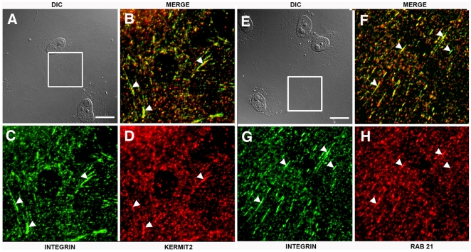 Figure 11. Colocalization of α5β1, kermit2, and Rab 21 in Xenopus XTC cells.XTC cells were stained for α5β1 (green), or kermit2 (red D), or Rab 21 (red H). (A, E) DIC images of adherent cells, boxes represent areas magnified in B–D and F–H. (A–D) Integrin (C; green) and kermit2 (D; red) colocalize in numerous vesicles and at focal adhesions (arrowheads in B–D). (E–H) Rab 21 (H; red) and integrin (G; green) colocalize in cytoplasmic vesicles and focal adhesions (arrowheads in F–H). Staining of cells with secondary antibodies alone produced no detectable signal. Size marker = 25 µM.
