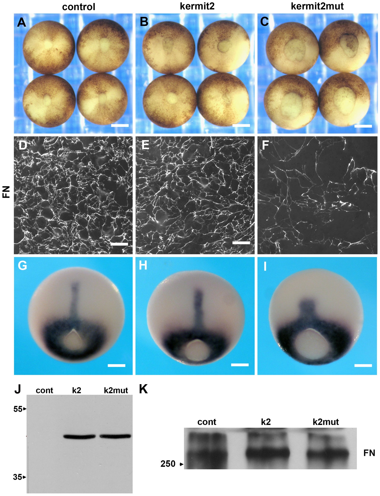 Figure 2. Kermit2mut inhibits Xenopus gastrulation. (A) Control embryos injected with water close their blastopores and (D) assemble a dense FN matrix. (B) Embryos injected with kermit2 also gastrulate and (E) assemble FN matrix normally. (C) Embryos injected with kermit2mut mRNA fail to close the blastopore and (F) have a sparse FN matrix. (G) Xbra in situ hybridizations indicate normal mesodermal patterning in (G) control embryos, as well as (H) embryos expressing kermit2, and in embryos expressing (I) kermit2mut. Note that axial extension is inhibited in (I). (J) Western blot demonstrating equal expression of HA tagged kermit2 and kermit2 constructs. Embryos injected with water (cont) do not express the construct, while embryos injected with RNA encoding kermit2 (k2) and kermit2mut (k2mut) express equal amounts of either construct. Molecular mass markers are indicated on the right of the panel. (K) Kermit2mut expression does not inhibit FN protein accumulation. Western blots demonstrate that there is no substantial change in FN protein expression (FN) in water injected embryos (cont), embryos expressing kermit2 (k2), or embryos expressing kermit2mut (k2mut). Molecular mass markers are indicated on the right of the panel. (A) size marker = 200 mM. (D) size marker = 30 mM. (G) size marker 100 mM.