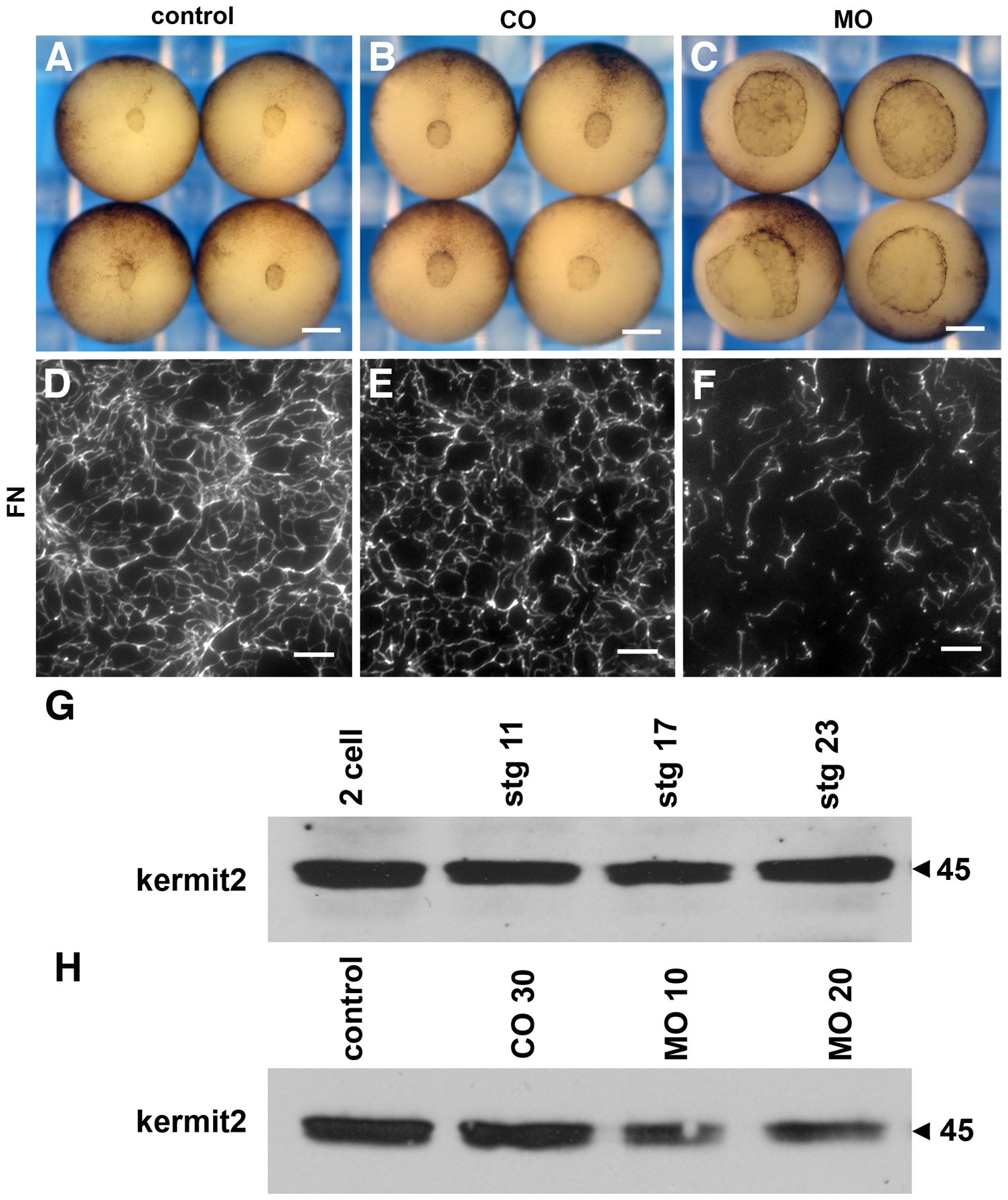 Figure 4. Morpholino knock down of kermit2 inhibits gastrulation and FN matrix assembly. (A) Ventral view of stage 12 embryos. (D) Late gastrula stage BCR stained for FN. (A) Stage 12 control embryos gastrulate normally and (D) assemble a dense FN matrix. Embryos injected with 20 ng of Kermit2 5 mismatch control morpholino (COMO; B) gastrulate normally, and (E) exhibit a small decrease in FN matrix assembly. (C) Embryos injected with kermit2 inhibiting morpholino (MO) exhibit delayed blastopore closure and (F) a sparse FN matrix network. (G) Western blot of kermit2 expression. Kermit2 is expressed throughout early development. (H) Morpholino knock down of kermit2 in stage 11 embryos. 30 ng of control morpholino (CO 30) has no effect on Kermit2 expression. The Kermit morpholino at 10 ng and 20 ng (MO 10 and MO 20) decreases kermit2 expression below control levels. Molecular mass is indicated to the left of the panel. (A) size marker = 200 mm. (D) size marker = 30 mm.