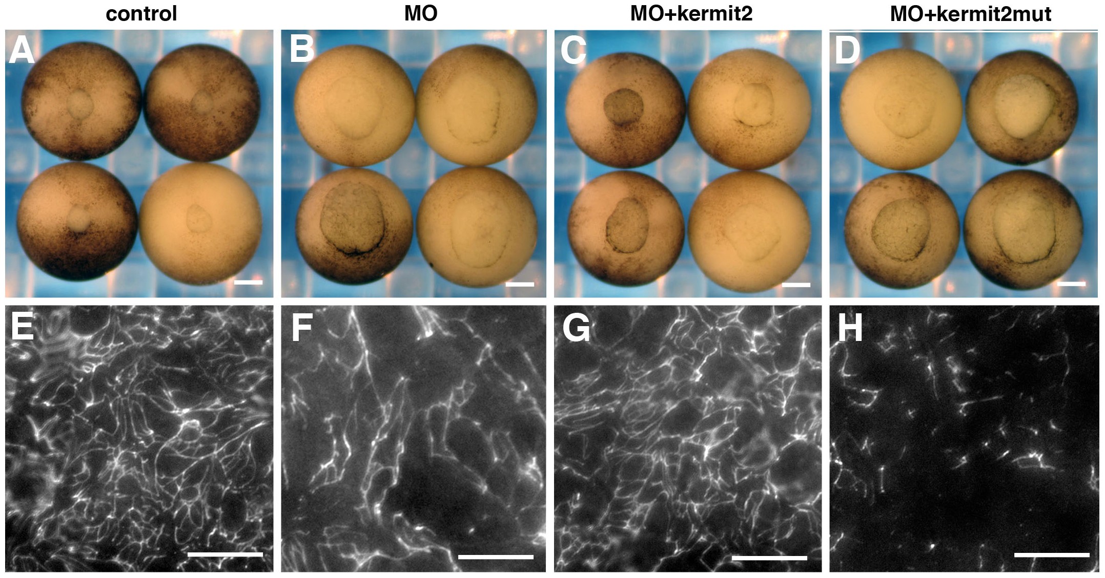 Figure 5. Expression of kermit2 mRNA rescues morpholino knock down of kermit2. (A) Ventral view of stage 12 embryos. (E) Late gastrula stage BCR stained for FN. (A) Stage 12 control embryos gastrulate normally and (E) assemble a dense FN matrix. Embryos injected with 10 ng of Kermit2 morpholino (MO; B) gastrulate normally, and (F) exhibit a small decrease in FN matrix assembly. (C) Embryos injected with kermit2 inhibiting morpholino and kermit2 mRNA (MO+kermit2) exhibit a small delay in blastopore closure and (G) a partial rescue of FN matrix assembly. (D) Embryos injected with the kermit2 morpholino and the dominant negative kermit2 construct (MO+kermit2mut) exhibit delayed blastopore closure and (H) significant reduction in FN matrix assembly. (A) size marker = 200 mm. (E) size marker = 30 mm.