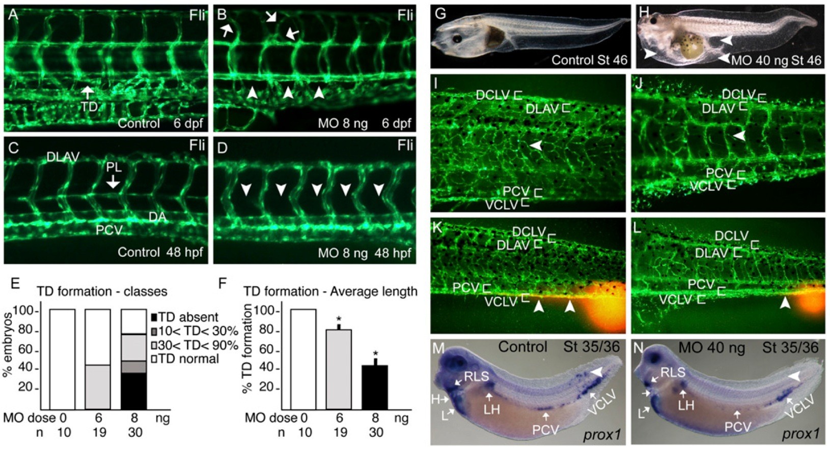 Figure 2. Clp24 is required for vascular and lymphatic development in D. rerio and X. laevis. (A) Control-injected (A,C) and clp24 MO- injected (B,D) embryos of a fluorescent zebrafish (Fli1:eGFPy1) line were screened at 6 dpf (A,B) and 48 hpf (C,D). Note extra branching of the ISVs (arrows in B) and absence of TD (arrowheads in B) at 6 dpf, and absence of parachordal lymphatic precursors (PL) (arrow in C) in clp24 morphants (arrowheads in D). (E,F) TD formation in clp24 morphants. (E) Percentage of affected embryos. (F) Average TD length over 10-somitetail segment at 6 dpf. (*) P < 0.05 versus control. (G,H) At stage 46, clp24 MO-treated (H) but not control-treated (G) X. laevis tadpoles had massive edema in heart, gut, and cloaca region (arrowheads). (I) Transgenic Tg(Flk1:eGFP) X. laevis embryos were injected with 40 ng of clp24 (J,L) or control MO (I,K). (I,J) Small capillaries, but not the main blood vessels, were to a large extent missing in clp24 morphants (arrowheads). (J) Both the VCLV and the DCLV failed to assemble into a compact lymph vessel, and the LECs appear dispersed and disorganized. (K,L) Lymphangiography for MO-treated tadpoles. Note the absence of dye uptake by the malformed VCLV in clp24 morphants (arrowhead, L) as compared with control (arrowheads, K). (M,N) Control (M) and clp24 (N) MO-treated X. laevis embryos were analyzed at stage 35/36 by prox1 ISH. The clp24 morphants show less staining in the PCV, heart (H), and rostral lymph sac (RLS), and in the area of the future lymph hearts (LH) and of the future VCLV. Note a reduced number of prox1-positive cells migrating across the tail from the VCLV to form the DCLV (arrowheads). Staining in liver (L) seems similar to control. (DA) Dorsal aorta; (DLAV) dorsal longitudinal anastomosing vessel.