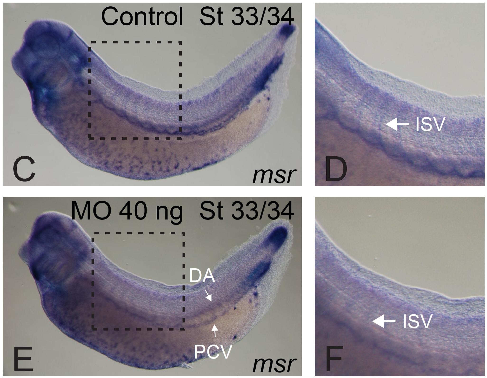 Supplemental Figure 4. D. rerio and X. laevis clp24 sequences and blood vascular effects in clp24 morpholino treated X. laevis embryos. A) D. rerio clp24 mRNA sequence. Black, bold text indicates a morpholino (MO) targeted against the 5untranslated region (clp24-UTR), blue underlined text indicates a MO (clp24-ATG)targeted against the translational start site (bold underlined) of clp24 mRNA. X. laevis partial mRNA sequence. Underlined is a MO targeted against the 5untranslated region, and in bold a MO targeted against the translational start site (bold underlined). B) Results from the experiments using the D. rerio clp24-ATG MO confirm the results obtained using the clp24-UTR MO, presented in Fig. 2. Toxic off-target effects of the second Clp24 MO assumably related to induction of a p53-dependent cell death pathway were attenuated by co-injection with a p53 morpholino as described (Robu et al. 2007). C-F) Control (C, D) and clp24 morpholino oligonucleotides (40 ng) (E, F) were injected into X. laevis embryos and the embryos were analyzed at st 33/34 by in situ hybridization with a msr probe staining the vasculature. At stage 32 msr was expressed in the heart and developing primary blood vessels. The clp24 morphants show less staining in the dorsal aorta (DA) and in the posterior cardinal vein (PCV), and have less intersomitic vessel (ISV) sprouts as compared to the control (3.67 0.39 (n=21) vs 4.1 0.33 (n=20), respectively), although this decrease did not reach statistical significance.