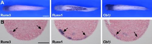 Fig. 4. Comparative analysis of Runx3, Runx1 and Cbfβ in blood progenitors. (A) Whole-mount in situ hybridization of stage 31 embryos viewed from the ventral side, anterior to the left, highlights the expression of Runx3, Runx1 and Cbfβ in blood progenitors. In these cells Runx1 appears to be expressed at higher level than Runx3 and Cbfβ. The scale bar represents 500 μm. (B) In situ hybridization on adjacent sections of a stage 31 embryo shows that Runx3, Runx1 and Cbfβ expression domain overlap at least in the lateral most aspect of the lateral plate mesoderm (arrows). The scale bar represents 100 μm.
