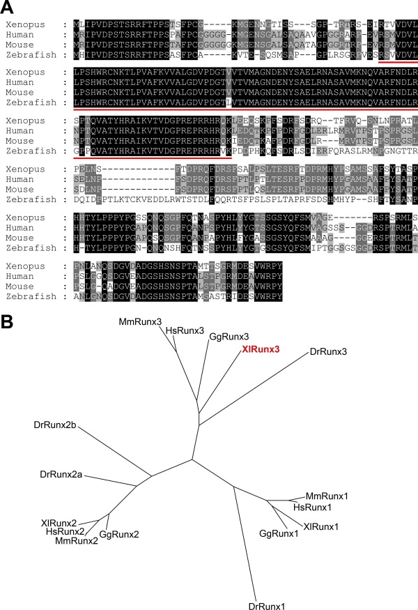 Fig. 1. Sequence and structure comparison of Runx3 proteins across species. (A) The predicted amino acid sequences from Xenopus laevis, human, mouse and zebrafish Runx3 were aligned using ClustalW. Conserved amino acids in all four species or in at least two species are highlighted in black and grey, respectively. The runt domain, signature motif of this class of molecules, is underlined in red. (B) Phylogenetic tree analysis of Runx proteins from Xenopus laevis (Xl), human (Hs), mouse (Mm), chicken (Gg) and zebrafish (Dr). Accession numbers for the source sequences are indicated in materials and methods.