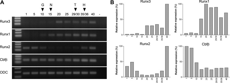 Fig. 2. Temporal expression of Runx3, Runx1, Runx2 and Cbfβ during embryogenesis. (A) RT-PCR analysis of the developmental expression of Runx3, Runx1, Runx2 and Cbfβ. Stages are according to Nieuwkoop and Faber (1967). Ornithine decarboxylase (ODC) is shown as a loading control. G, onset of gastrulation; N, mid-neurula stage; T, tailbud stage; H, hatching stage. (B) Real-time RT-PCR analysis of Runx3, Runx1, Runx2 and Cbfβ. Each value has been normalized to the level of ODC.