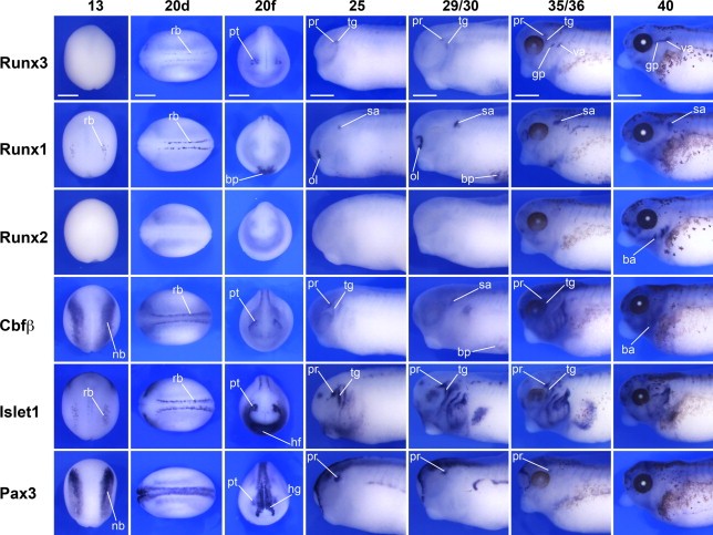 Fig. 3. Comparative analysis of the expression of Runx and Cbfβ genes by whole-mount in situ hybridization. Runx3 is first detected at stage 20 in two domains, the developing primary sensory (Rohon-Beard) neurons and the trigeminal-profundal placode. At the same stage Cbfβ is also co-expressed in both domains, while Runx1 is restricted to Rohon-Beard neurons. At later stages, stage 25 and up, Runx3 expression appears to be largely confined to the head region and in a number of cranial nerves including the ganglion of the trigeminal, vagal and glossopharyngeal nerves. To confirm the tissue-specific expression of Runx genes, we also performed in situ hybridization for Pax3 and Islet1 in staged matched embryos. Pax3 and Islet1 share common expression domains with Runx genes in the profundal-trigeminal placode (Pax3 and Islet1), Rohon-Beard sensory neurons and cranial ganglia (Islet1). Stages are according to Nieuwkoop and Faber (1967). Stage 13, dorsal view anterior to top. Stage 20d, dorsal view anterior to the left. Stage 20f, frontal view dorsal to top. Stage 25â40, lateral view of the head region, anterior to the left and dorsal to top. ba, branchial arches region; bp, blood progenitors; hf, heart field; hg, hatching gland; gp, glossopharyngeal; nb, neural plate border; ol, olfactory placode; pr, profundal ganglia; rb, Rohon-Beard neurons; sa, statoacoustic ganglia; tg, trigeminal ganglia; pt, profundal-trigeminal placode; va, vagal nerve. The scale bars in the upper row represent 500 μm.