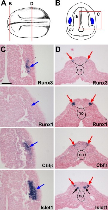 Fig. 5. Comparative analysis of Runx3, Runx1, Cbfβ and Islet1 expression in the profundal-trigeminal placode and Rohon-Beard sensory neurons at stage 20. (A) Schematic representation of a stage 20 embryo view from the dorsal side, anterior to the left. Modified from Nieuwkoop and Faber (1967). (B) Schematic representation of a transverse section at the level of the diencephalon, corresponding to the line labeled âBâ in panel (A). Dorsal to top. The blue areas indicate the position of the developing profundal-trigeminal placode. The boxed area labeled âCâ is the region of the section shown in subsequent panels (C). (C) Runx3, Cbfβ and Islet1 are co-expressed in the profundal-trigeminal placode (blue arrows), while Runx1 is not detected in this tissue. (D) Transverse sections in the trunk region corresponding to the line labeled âDâ in panel (A). All four genes are co-expressed in Rohon-Beard sensory neurons (red arrows). Islet1 is also expressed in the population of ventral interneurons (black arrows). The notochord is outlined with a solid line, while the position of the neural tube is underlined with dashed lines. The probes are indicated in the lower right corner of each panel. di, diencephalon; no, notochord; ov, optic vesicle. The scale bar in panel C represents 100 μm.
