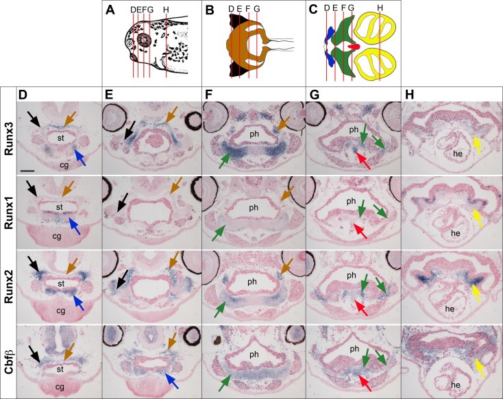 Fig. 6. Comparative analysis of Runx3, Runx1, Runx2 and Cbfβ expression in the craniofacial cartilage at stage 40. (A) Schematic representation of the head of a stage 40 embryo viewed from the lateral side, dorsal to top, anterior to the left. Modified from Nieuwkoop and Faber (1967). (B and C) Schematic representations of the ventral (B) and dorsal (C) cranial cartilage elements. Modified from Sadaghiani and Thiebaud (1987). The cartilage elements are color-coded: ethmoid-trabecular (brown), quadrate (black), Meckelâs (blue), cerathoyal (green), basihyal (red) and branchial (yellow). In panels (A), (B) and (C) the lines labeled âDâ, âEâ, âFâ, âGâ and âHâ indicate the level of the transverse sections shown in the subsequent panels. cg, cement gland; he, heart; ph, pharynx; st, stomodeum. The scale bar in panel D represents 100 μm.