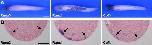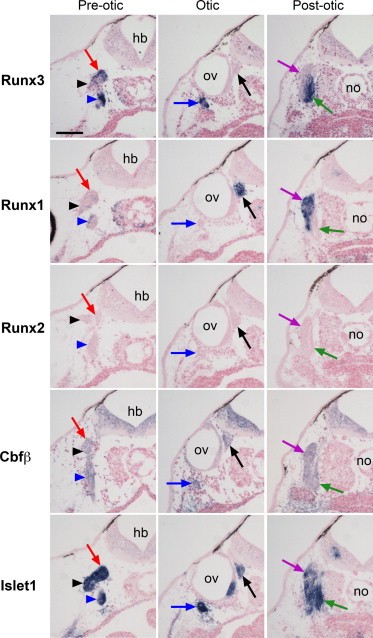Fig. 7. Comparative analysis of Runx3, Runx1, Runx2, Cbfβ and expression in neurogenic placode derivatives at stage 40. Transverse sections were performed at three levels along the antero-posterior axis; the pre-otic, the otic, and post-otic regions. Each column shows sections from approximately the same level. Trigeminal ganglion (red arrows), ganglion of anterodorsal lateral line nerve (black arrowheads), ganglia of facial and anteroventral lateral line nerves (blue arrowheads), ganglia of glossopharyngeal and middle lateral line nerves (blue arrows), statoacoustic ganglion (black arrows), ganglion of vagal nerve (green arrows), ganglion of posterior lateral line nerve (purple arrows). hb, hindbrain; no, notochord; ov, otic vesicle; The scale bar in the upper left panel represents 100 μm.