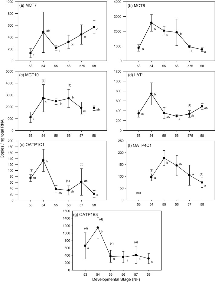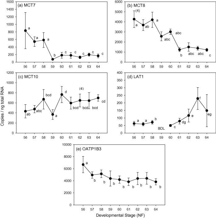 Survey of TH transporter expression in the metamorphosing Xenopus tropicalis hind limb. Gene expression was quantified using qRT-PCR and normalized to ng of total RNA. Values are reported as mean ± SD with a sample size of n = 5, unless otherwise noted (n). Letters differentiate expression levels that are significantly different (p < 0.05). Results of OATP4A1 were not shown do to its stable expression (see text). BDL; below detection limit.