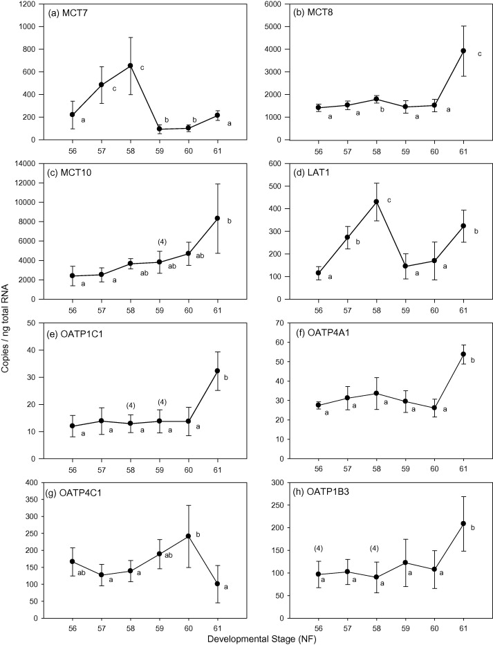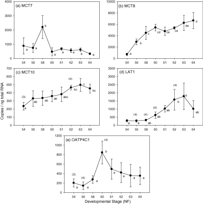 Survey of TH transporter expression in the metamorphosing Xenopus tropicalis gill. Gene expression of MCT7, MCT8, MCT10, LAT1, OATP1C1 and OATP4A1 were quantified using qRT-PCR and normalized to ng of total RNA. Values are reported as mean ± SD with a sample size of n = 5, unless otherwise noted (n). Letters differentiate expression levels that are significantly different (p < 0.05).