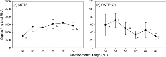 Survey of TH transporter expression in the metamorphosing Xenopus tropicalis brain. Gene expression was quantified using qRT-PCR and normalized to ng of total RNA. Values are reported as mean ± SD with a sample size of n = 5. Letters differentiate expression levels that are significantly different (p < 0.05). Results of MCT7, MCT10, LAT1, OATP4A1 and OATP1B3 were not shown do to their stable expression (see text). Transporter OATP4C1 was expressed at or below limit of detection.
