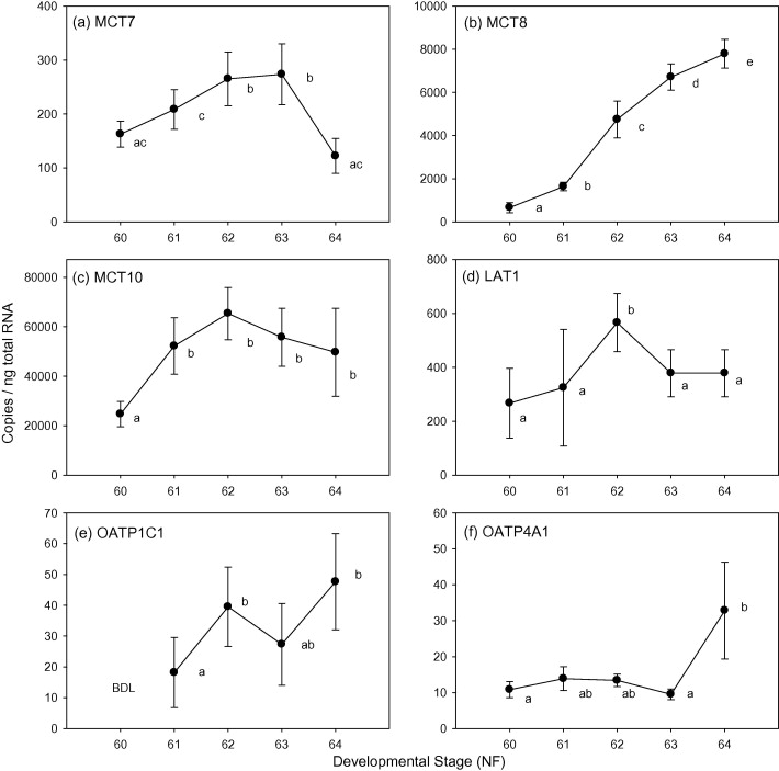 Survey of TH transporter expression in the metamorphosing Xenopus tropicalis tail. Gene expression was quantified using qRT-PCR and normalized to ng of total RNA. Values are reported as mean ± SD with a sample size of n = 5. Letters differentiate expression levels that are significantly different (p < 0.05). Results of OATP4C1 were not shown do to its stable expression (see text). Transporter OATP1B3 was expressed at or below limit of detection. BDL; below detection limit.