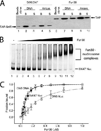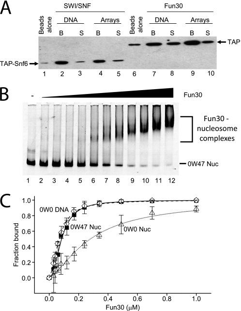 FIGURE 4. The Fun30 binds DNA and chromatin. A, Fun30 binds to nucleosome arrays efficiently. Immobilized G5E4 (either DNA or reconstituted into nucleosomal arrays), generated as described under “Experimental Procedures,” was incubated with an equal amount of Fun30 (lanes 7–10) or the SWI/SNF complex (lanes 2–5, as control) based on anti-TAP Western blotting normalization. The amount of bound protein (SWI/SNF complex or Fun30) was determined by separating the supernatants (S) from the beads (B), washing the beads, and running them on a 12% SDS gel followed by Western blot analysis using the anti-TAP antibody for detection of the proteins. The background binding of SWI/SNF or Fun30 to the magnetic Dynabeads alone are shown in lanes 1 and 6, respectively. B, nucleosomes were assembled on the fragment 0W47 in which the 601 nucleosome positioning sequence directs assembly of a nucleosome such that it is flanked by 47 bp of linker DNA on one side. Incubation of 30 nm 0W47 nucleosomes with increasing concentrations of His6 Fun30 (28 nm to 1 μm, lanes 2–11) resulted in a gel-shifted species (Nuc/Fun30). C, binding curves indicating the fraction of the Fun30-bound template following incubation with the indicated concentrations of Fun30. Quantification was based on the material remaining unbound in gel shifts such as that shown in B. ◇, corresponds to 0W0 DNA; ■, corresponds to 0W47 nucleosomes; and ▵, corresponds to 0W0 nucleosomes.