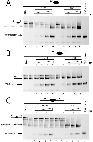 FIGURE 6. Fun30 has higher activity in histone dimer exchange than nucleosome repositioning. 10-μl reactions containing 0.25 pmol of nucleosomes (250 nm) in which H2B is fluorescently labeled with Cy5 assembled at the murine mammary tumor virus nucleosome A (NucA) positioning sequence flanked by the indicated lengths of linker DNA were incubated with Fun30 (100, 200, 300, and 400 pm, lanes 3–6) or RSC (100, 200, 300, and 400 pm, lanes 8–11) in the presence of 0.75 pmol of histone tetramers assembled onto 147-bp DNA (0W0). In each panel, lane 1 contains nucleosomes assembled on the appropriate donor DNA fragment and lane 12 contains the 0W0 fragment assembled with an octamer including fluorescently labeled H2B. Following native gel electrophoresis, the fate of H2B was monitored by fluorescent scanning of the gels. In some cases the signal moves to a location consistent with repositioning of nucleosomes on the donor DNA fragment. In others, transfer to the 0W0 acceptor DNA, which has a distinct mobility, could be detected. Fun30 was observed to cause dimer exchange even in circumstances where repositioning was inefficient. A, the donor nucleosome has an asymmetric linker DNA of 54 bp on one end and 18 bp on the other (54A18). B, the donor nucleosome has a 54-bp linker DNA on one end and 0 bp on the other (54A0). C, the donor nucleosome has 54-bp linkers on either side (54A54).